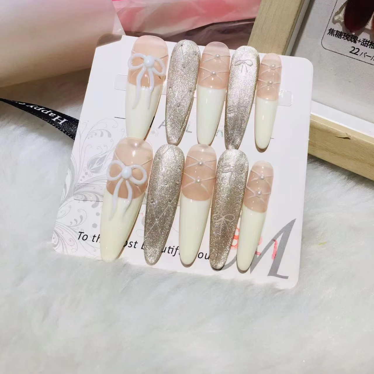 เล็บแบบกดประกายเพชรรูปแมวตาสีเงินขนาดกลางแบบสั้นทำด้วยมือสไตล์ฝรั่งเศสสีทองวัสดุ ABS เกรดสูง